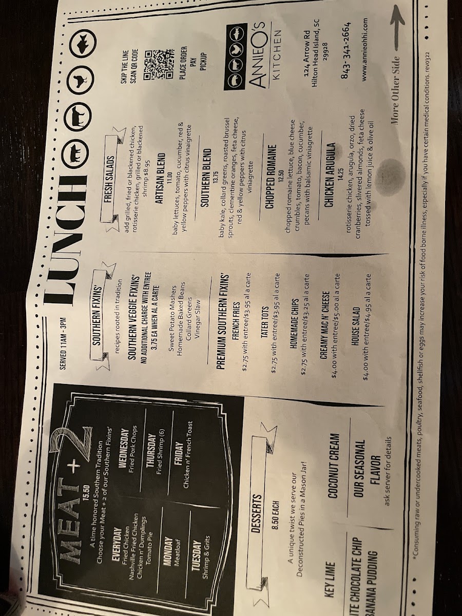 Introducing Annie O's Kitchen, a hidden gem nestled in Hilton Head Island, SC, renowned for its authentic Southern cuisine. Located at 11 Target Rd, this cozy eatery boasts a menu that celebrates the flavors of the South with a variety of mouthwatering options. Highlighting their dinner offerings, the pork ribs are a must-try; perfectly chargrilled and slathered in hickory smoked BBQ sauce, they are irresistibly tender. Other standout dishes include homemade sides like sweet potato mashers, collard greens, and their creamy mac n' cheese, all priced affordably at $3.50 each.